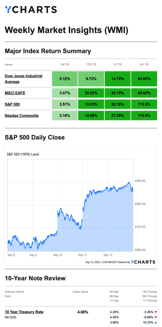 Source: YCharts.com, September 13, 2025. Weekly performance is measured from Friday, September 8, to Friday, September 12. TR = total return for the index, which includes any dividends as well as any other cash distributions during the period. Treasury note yield is expressed in basis points.